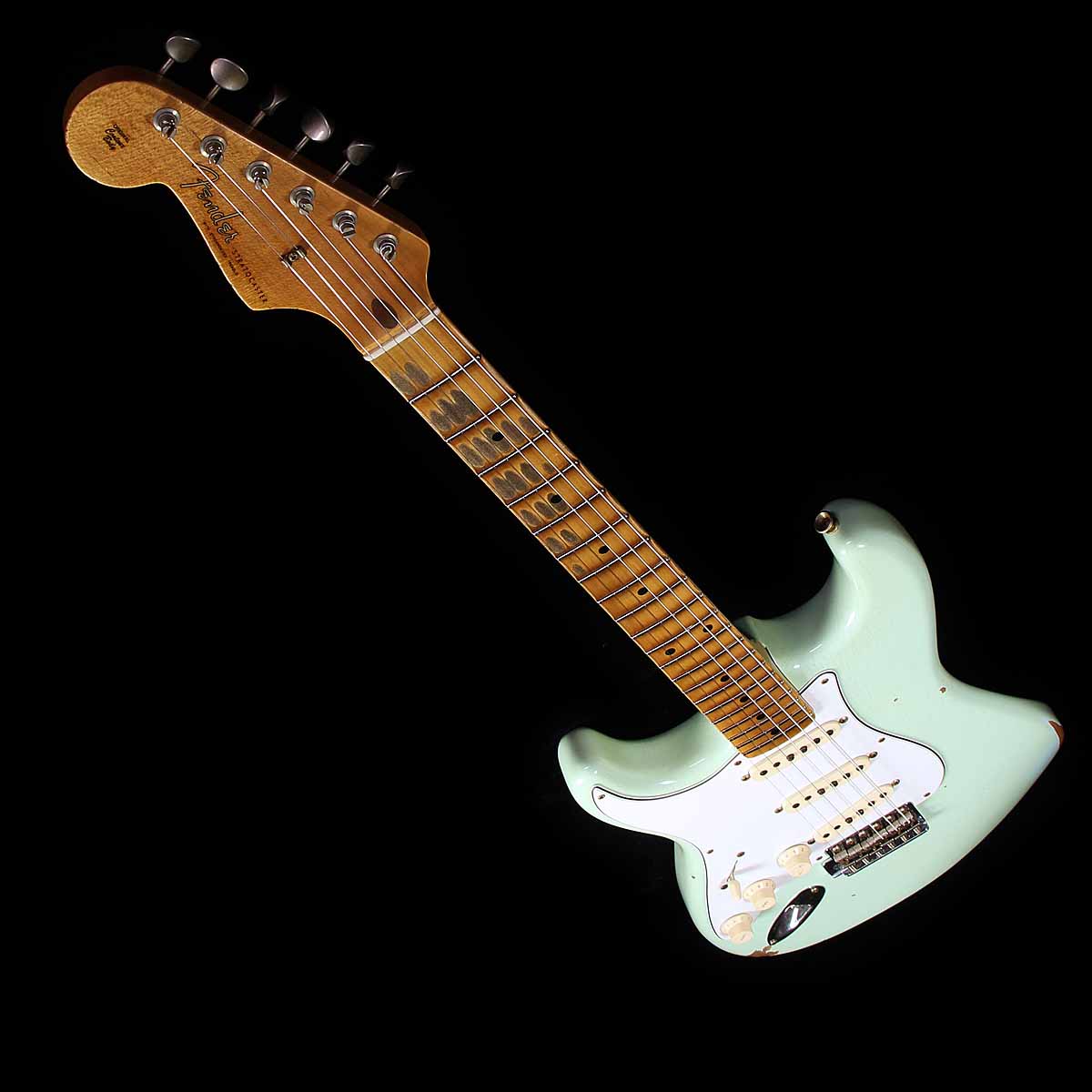 Nothing says 50s more to me than a surf green finish on a Stratocaster. Here’s a gorgeous Fender Custom Shop 58 relic Strat. This one has my personal favorite handwound Custom Shop Fat 50s pickups, maple fretboard, 6105 frets, 9 .5 radius and a comfortable 54 Soft V carve on a 5/4 quartersawn maple neck. Weight is 7 3/4 pounds. Includes deluxe hardshell case, strap and certificate of authenticity.