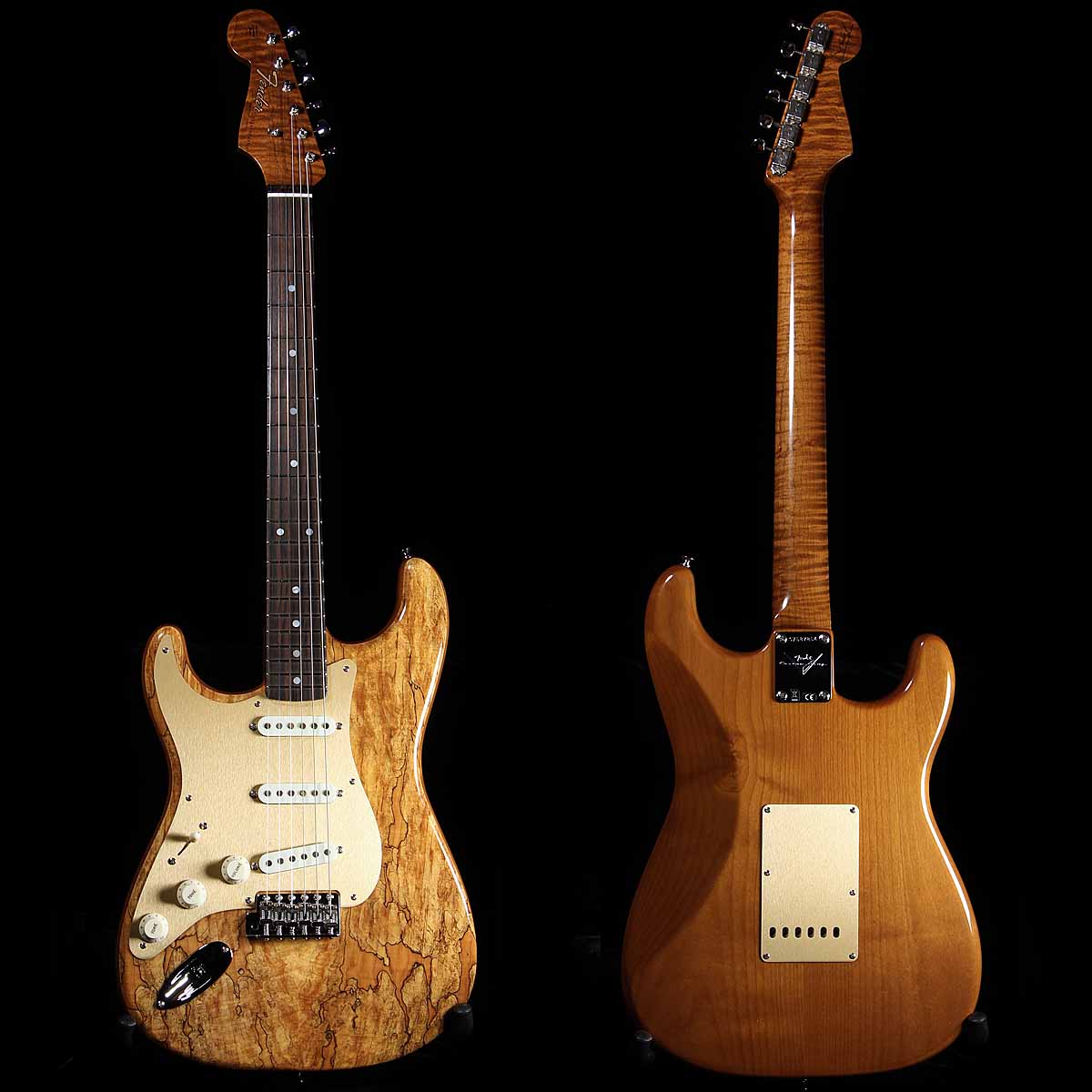 Here’s a rare and spectacular Fender Custom Shop Artisan spalted maple Strat. The body is roasted alder with a beautifully figured spalted maple top; the neck is AAAA roasted flame maple with a Macassar ebony fretboard and narrow tall 6105 frets. The comfortable 63 Strat C profile neck sports a 9.5-12 compound radius, and the pickups are handwound Custom Shop Poblano Strat with a reverse wound reverse polarity middle pickup. Mother of pearl fretboard dots, a gold anodized pickguard and a NOS nitro finish complete the package. With certificate of authenticity, Custom Shop strap and hardshell case.