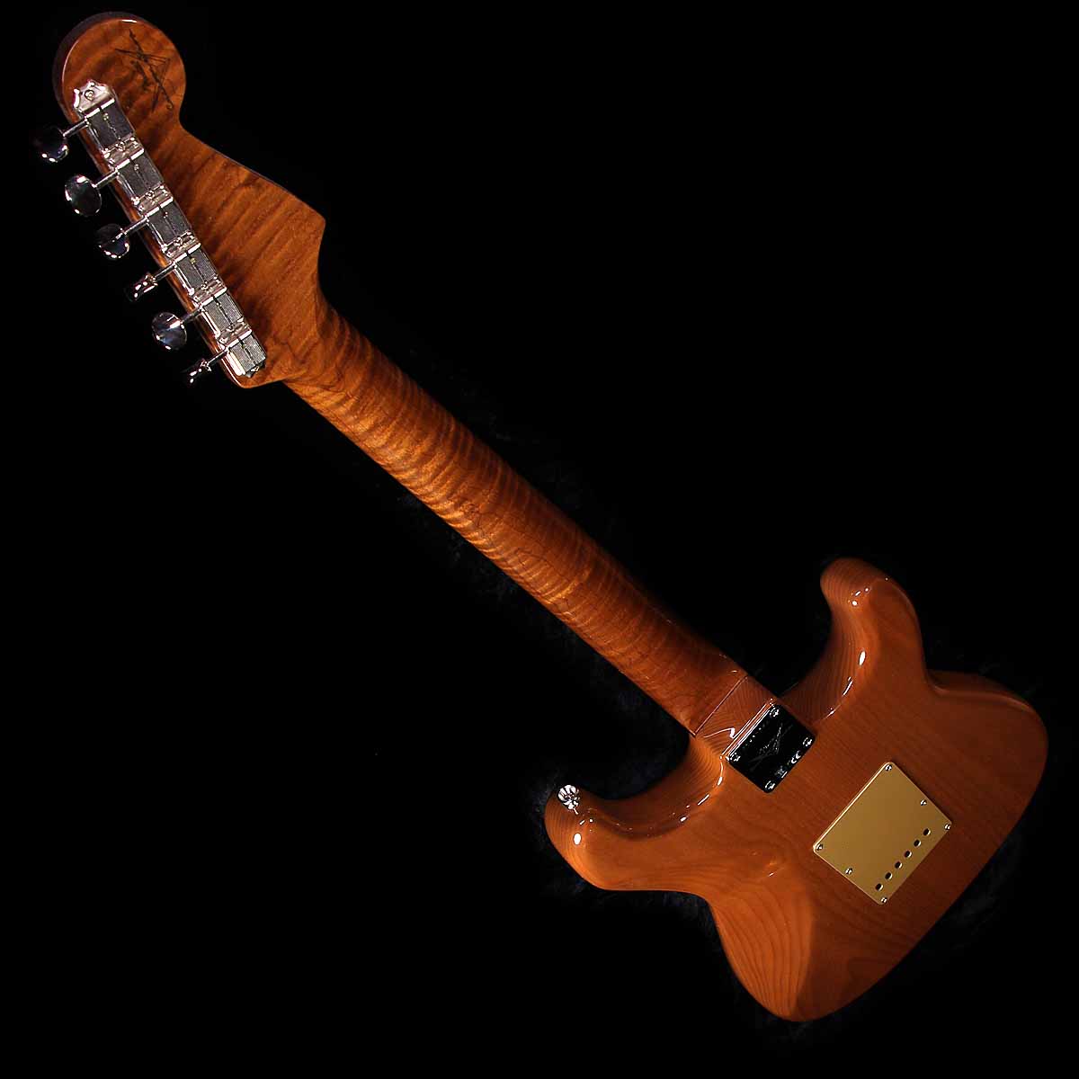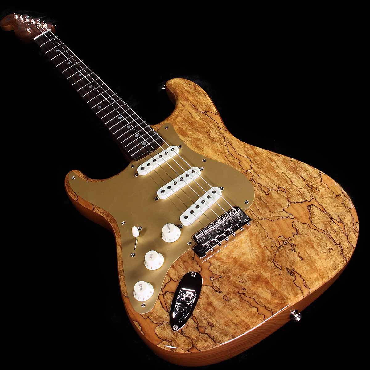 Condition: New; Body: Roasted alder with spalted maple top; Neck: AAAA roasted flame maple, 63 Strat Style C profile (.810, .970), 9.5-12 compound radius; Nut: 1.650; Color: Aged natural; Pickups: handwound Custom Shop Poblano Strat; Scale: 25.5; Orientation: Lefthanded (of course)