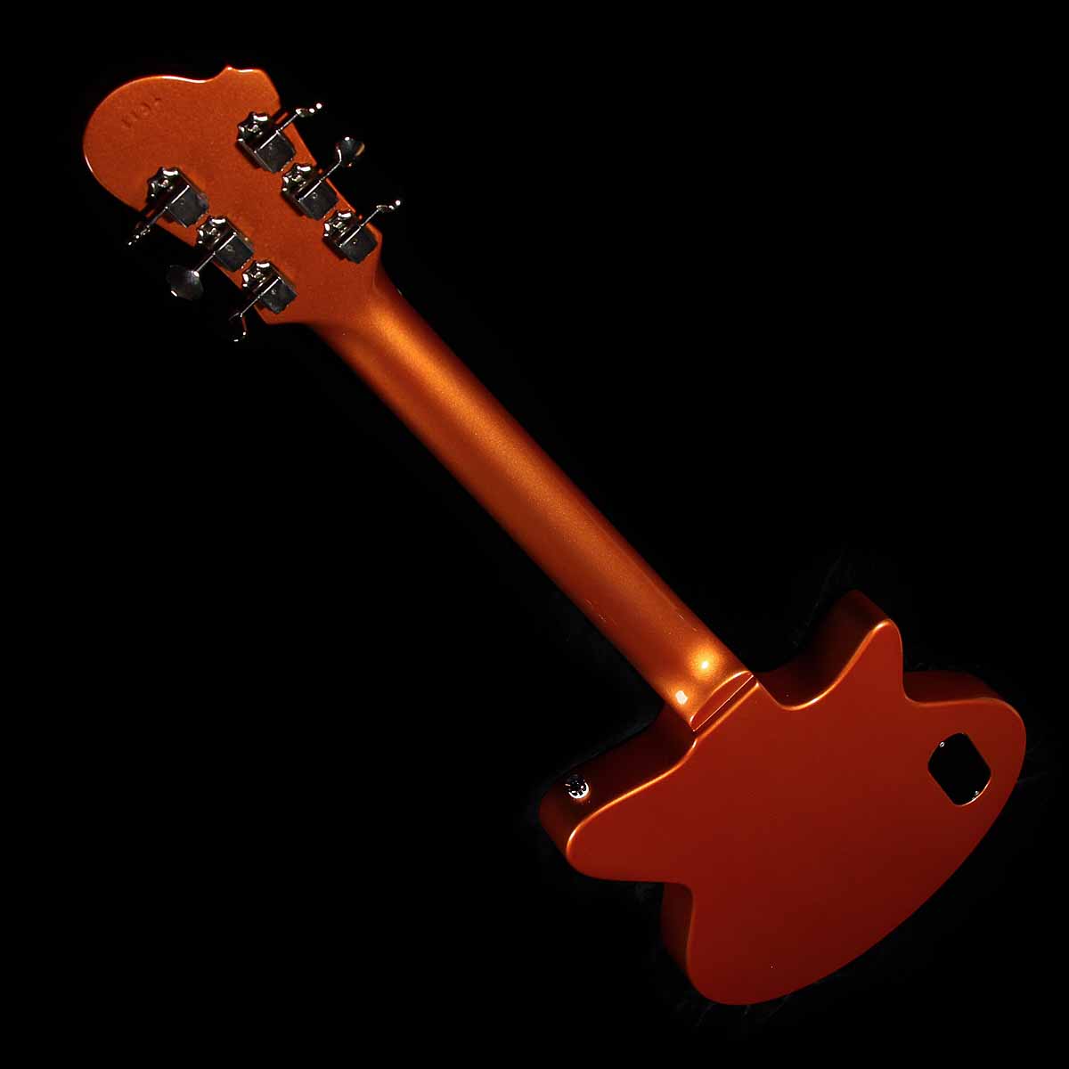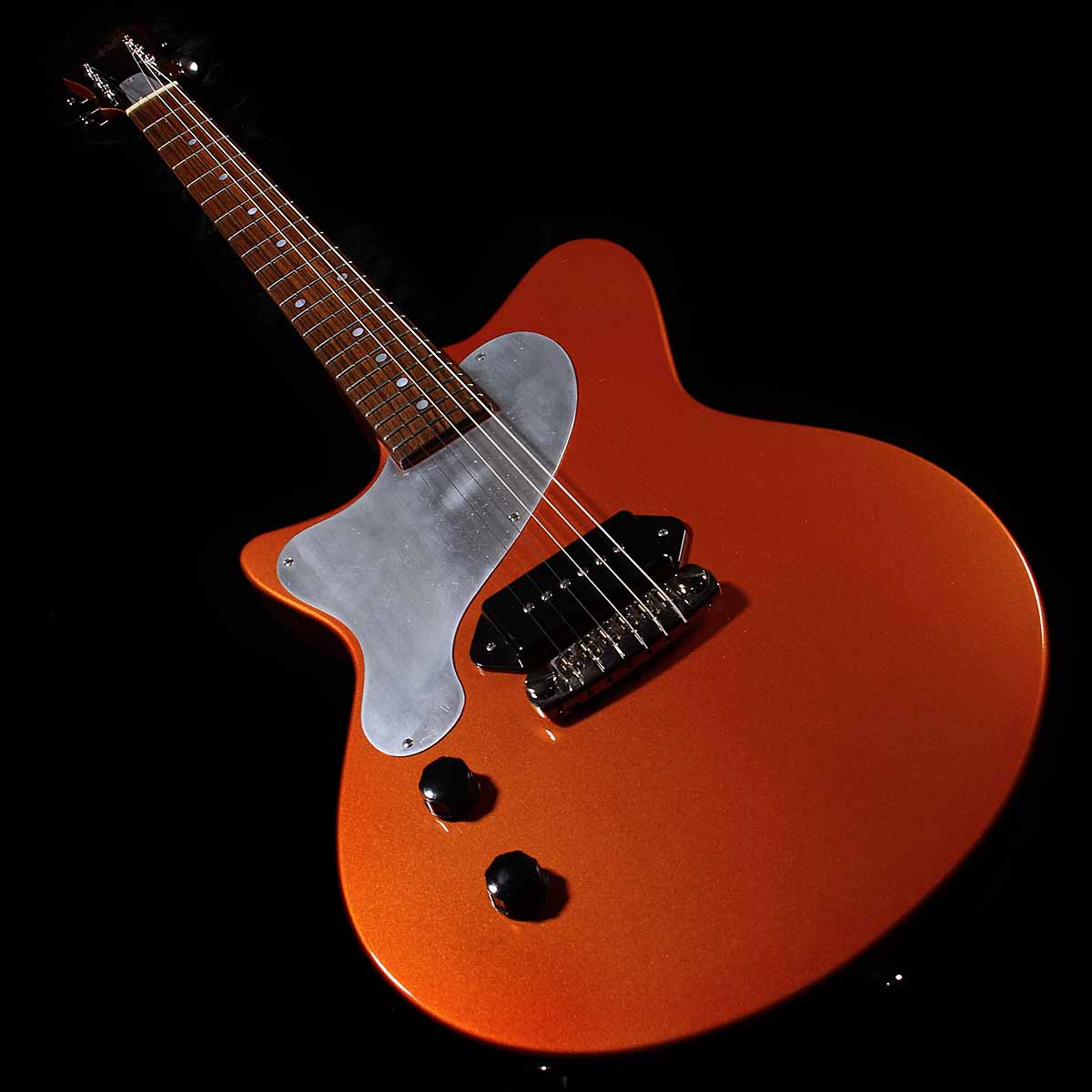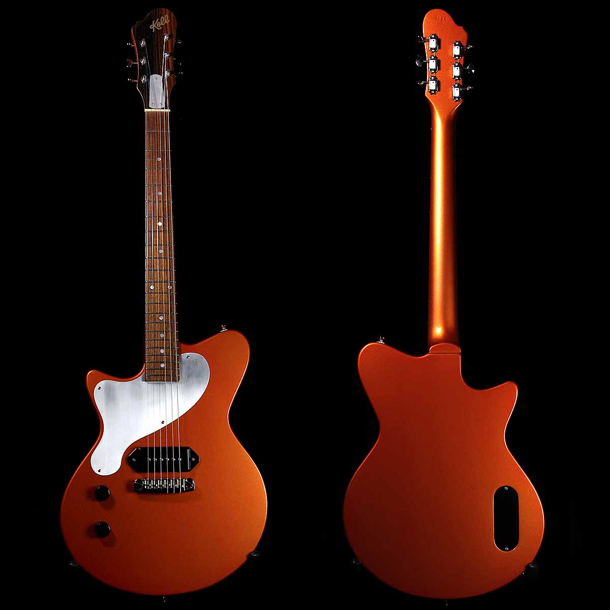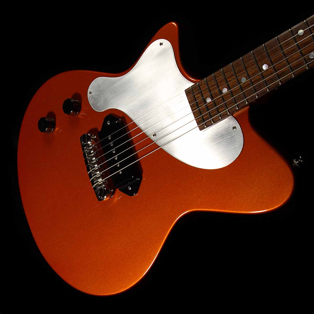 Here’s a 2016 Koll Junior Glide in excellent condition. A single Arcane P90, volume and tone control — sometimes less is more. Great rock and roll guitar. Nice metallic orange, silver metal pickguard, some slight wear on that. Medium neck, comfortable. Upgraded with true lefty pots, originals included. With nice hardshell case. Sometimes less really is more.