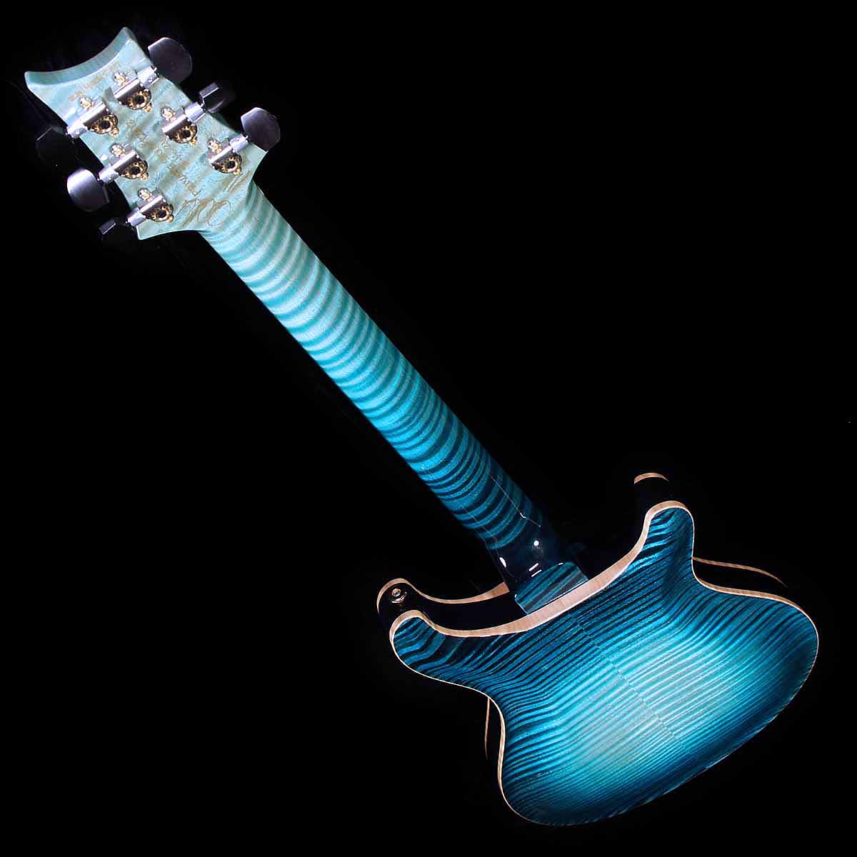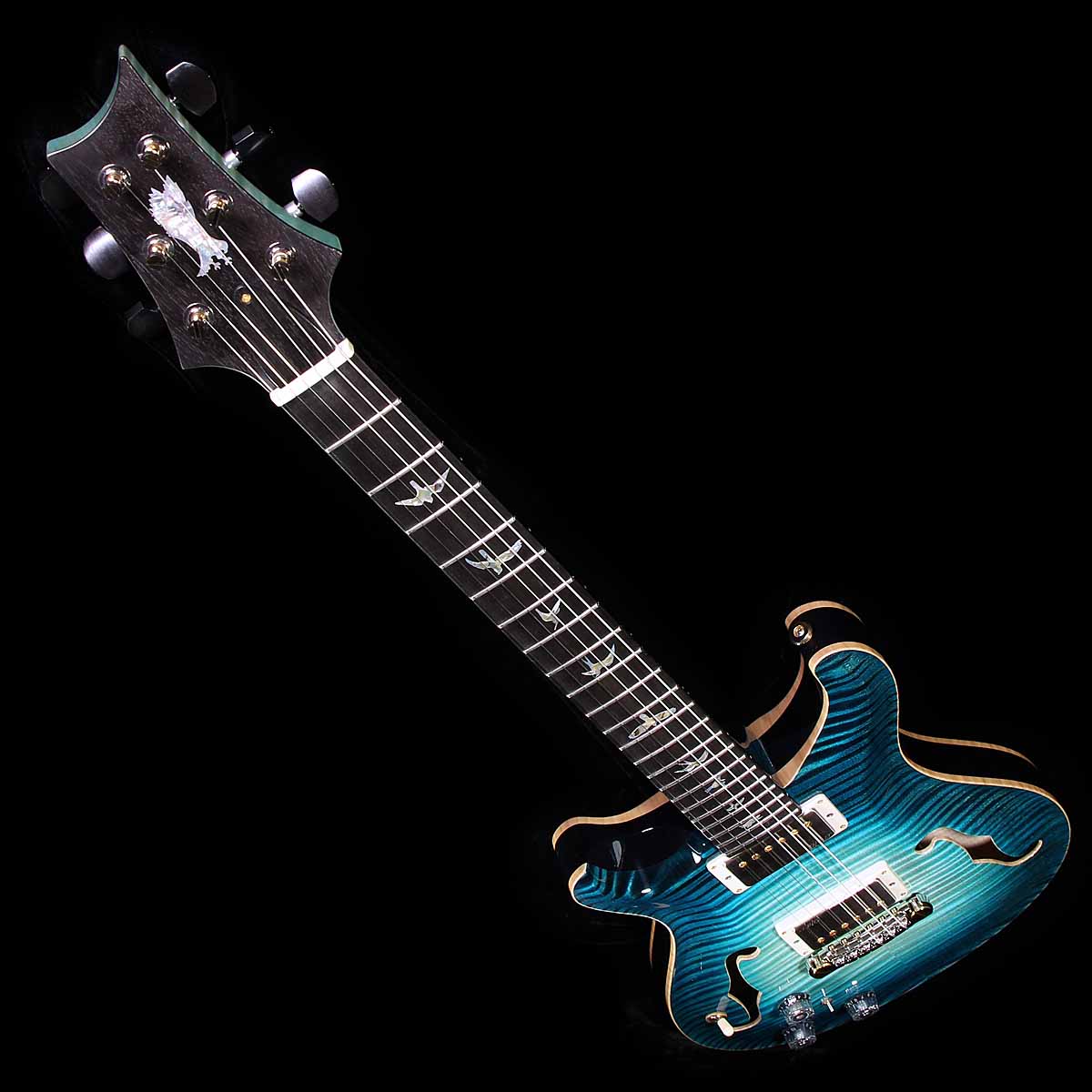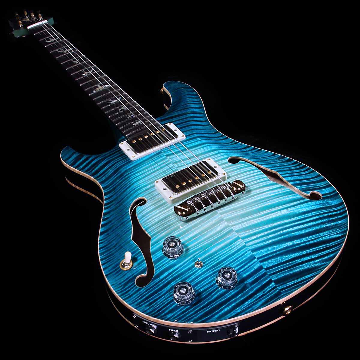 Here is a very rare new lefthanded PRS Private Stock Hollowbody 2 guitar. The guitar has a striking curly maple top and matching back, with an African mahogany core, curly maple neck stained to match the tops, ebony and fingerboard, abalone J Bird inlays with white mother of pearl outlines, and is finished in Private Stock’s nitro Subzero Glow. The guitar has 58/15 LT pickups with a piezo bridge. The piezo can be mixed with the magnetic pickups or sent out a separate jack to an acoustic amp. Endless tone variations. The guitar is a true hollowbody — no centerblock — and it is light, perfectly balanced, and plays like a dream. Lifetime warranty and brown paisley PRS Private Stock fitted case. A lifetime guitar.